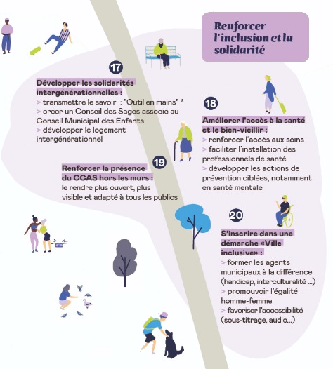 Une ville forte est une ville qui n’oublie personne. Cet axe porte une attention particulière à nos aînés, aux publics fragilisés, à l’accès aux soins, à la lutte contre l’isolement et à l’égalité des chances. Il s’agit de développer des actions concrètes pour favoriser l’entraide, soutenir les initiatives solidaires et rendre les services municipaux plus accessibles à tous. Notre vision : une commune inclusive où chacun peut vivre dignement et participer pleinement à la collective.