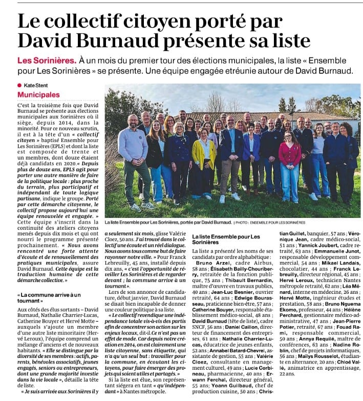 Article Ouest-France du 18/02/2026 : Aux Sorinières, le collectif citoyen porté par David Burnaud présente sa liste