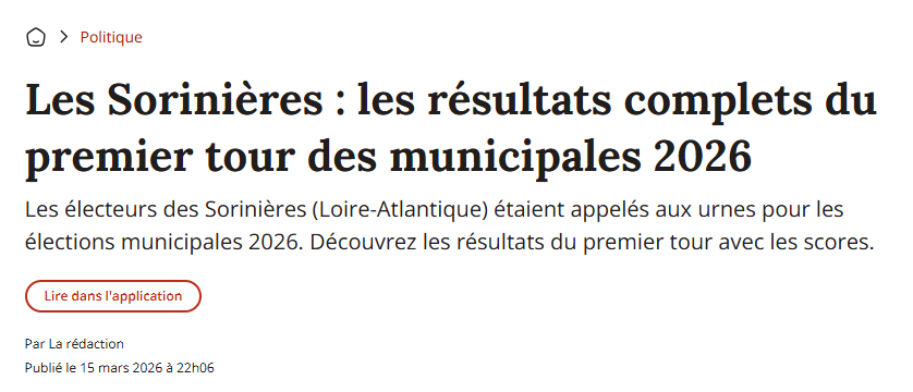 Article La Montagne du 15/03/2026 : Les Sorinières : les résultats complets du premier tour des municipales 2026