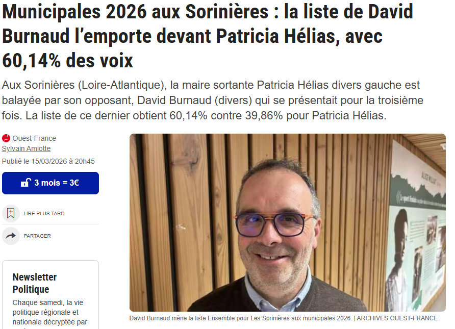 Article Ouest-France du 15/03/2026 : Municipales 2026 aux Sorinières : la liste de David Burnaud l’emporte devant Patricia Hélias, avec 60,14% des voix