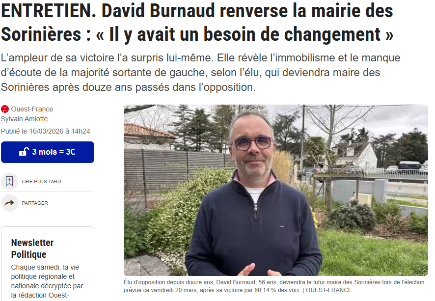 Article Ouest-France du 16/03/2026 : ENTRETIEN. David Burnaud renverse la mairie des Sorinières : « Il y avait un besoin de changement »