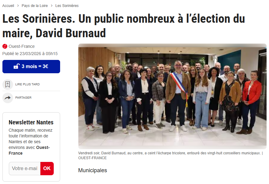 Article Ouest-France du 23/03/2026 : Les Sorinières. Un public nombreux à l’élection du maire, David Burnaud