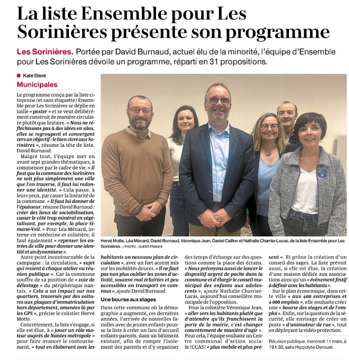 Article Ouest-France du 03/03/2026 : « Il faut redonner une identité à notre commune », la liste Ensemble pour Les Sorinières présente son programme